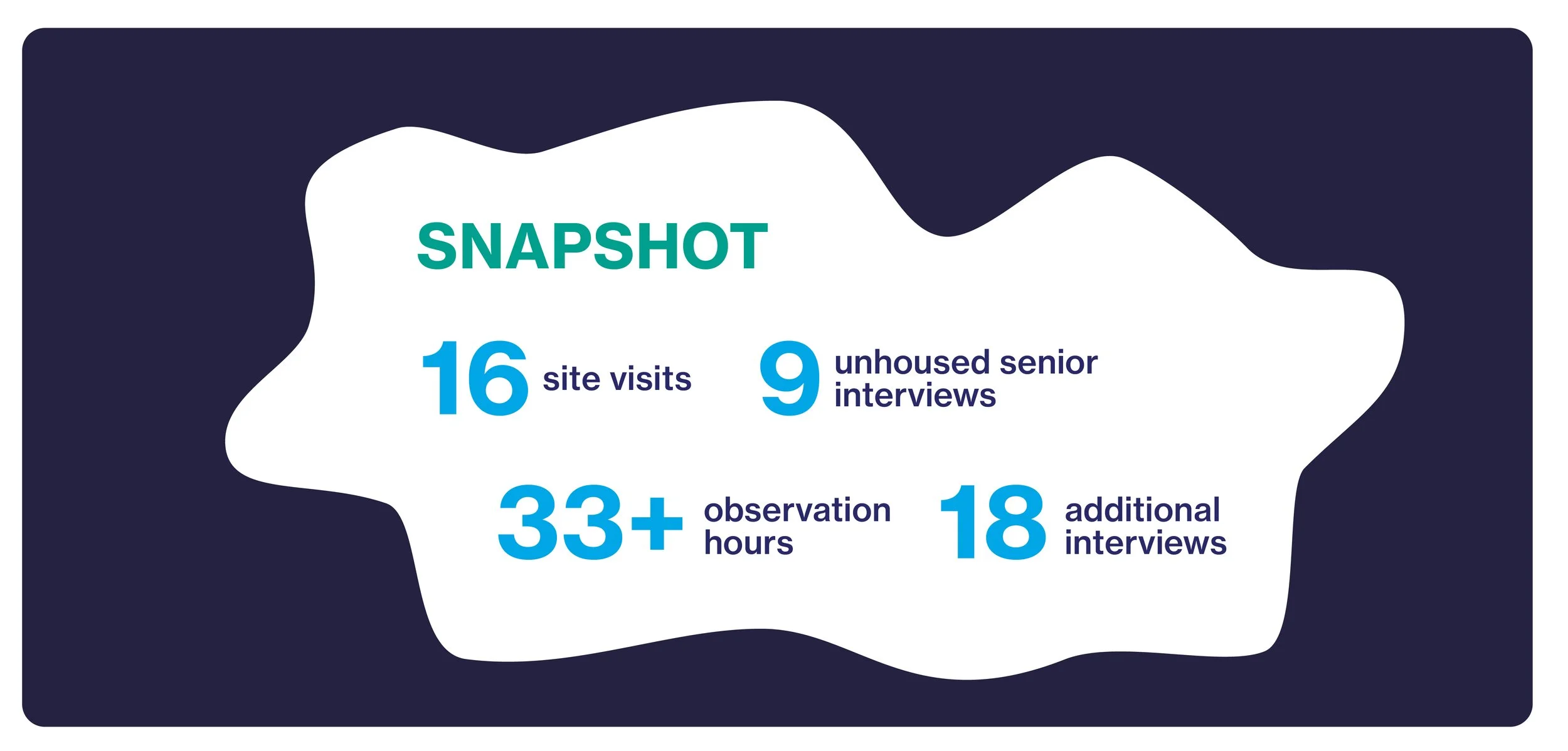 We spent 10 weeks conducting field research and talking to 20+ stakeholders - unhoused seniors, food pantry workers, volunteers, temporary housing staff, and NYC council members - to get a well-rounded understanding of the food access experience of unhoused seniors.