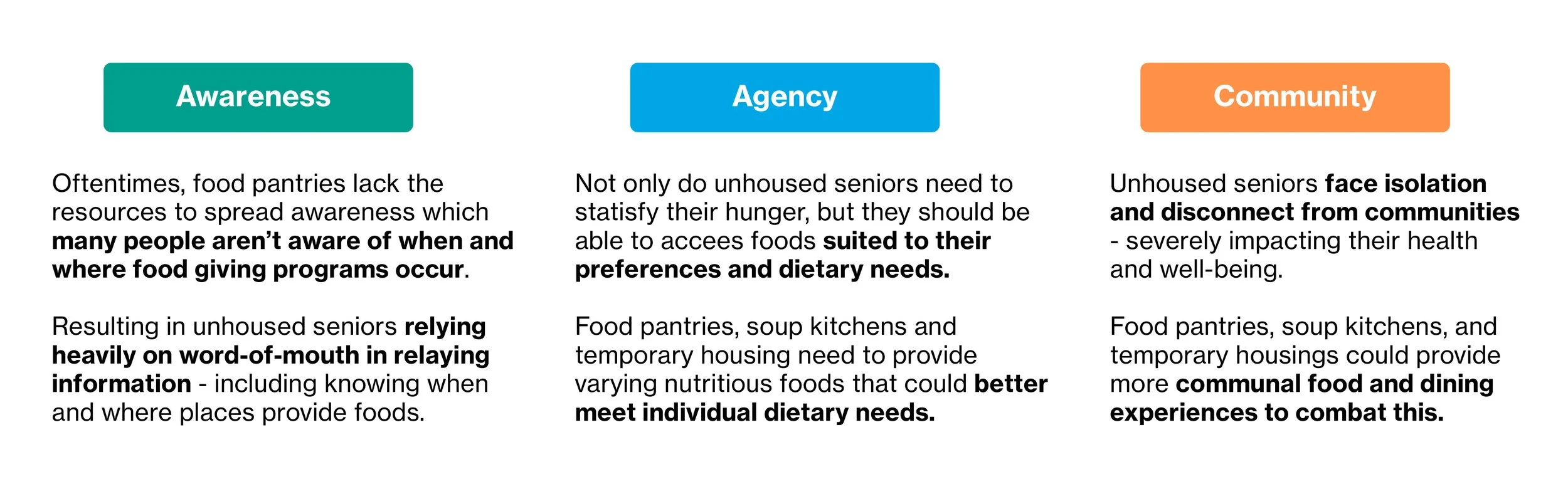 Through our conversations with the various stakeholders (unhoused seniors, food pantries, and temporary housings), we discovered several converging points and this served as a starting point for us to design a quick-win solution whilst understanding a need for larger system change.