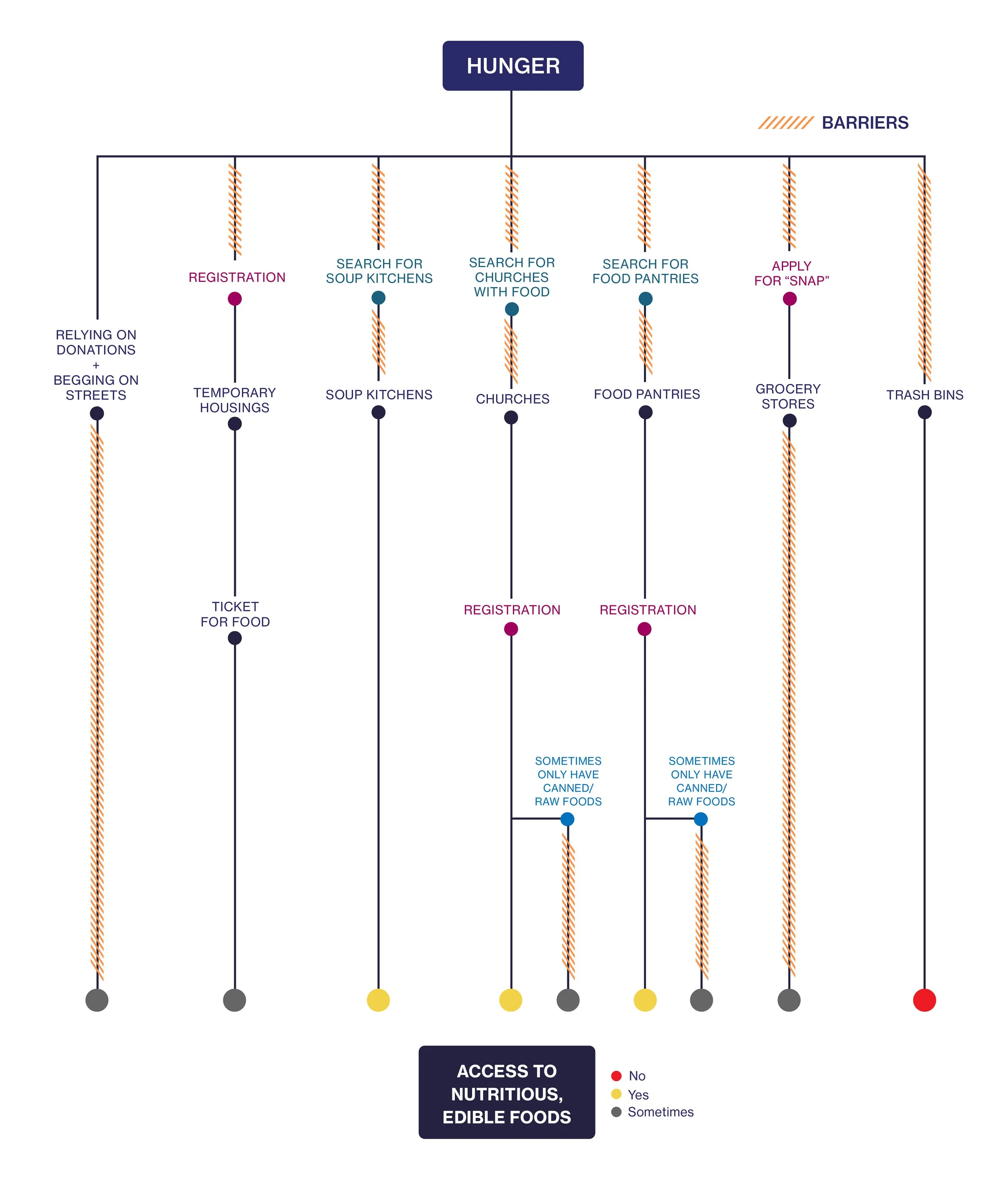 We mapped out their typical journeys to obtain food and discovered there were several. However, we learned that there are also many barriers and challenges existing in these avenues.